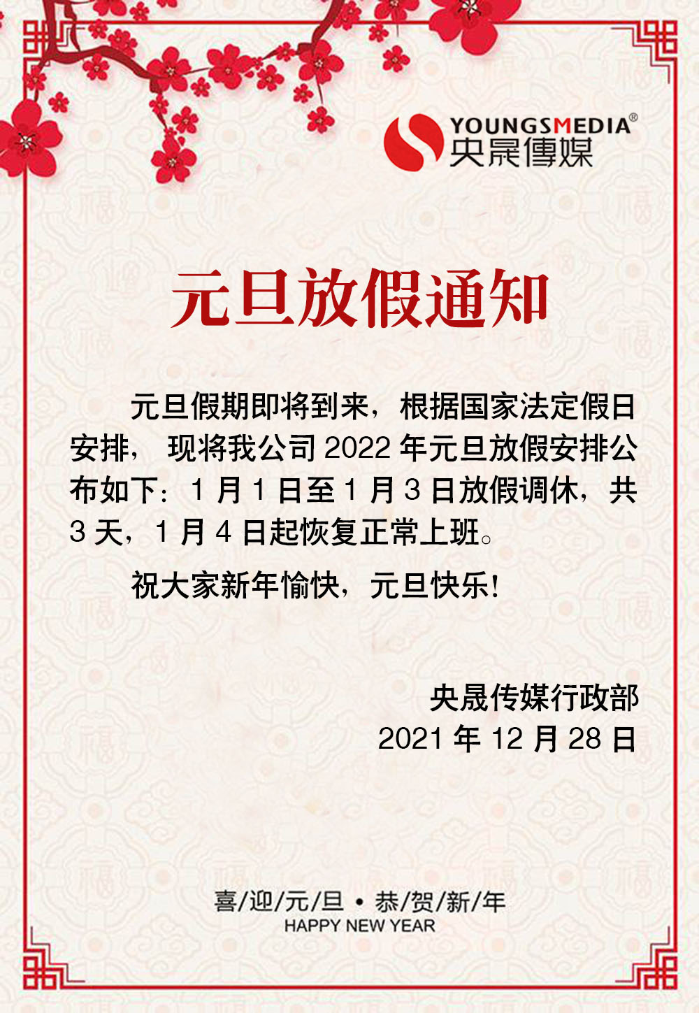 根据国家法定假日安排,现公司研究决定,2022年1月1号(星期六)~ 1月3号(星期一)放假3天,1月4号(星期二)起正常上班。请大家安排好假期作息。最后,央晟传媒祝各位新年快乐,元旦愉快。