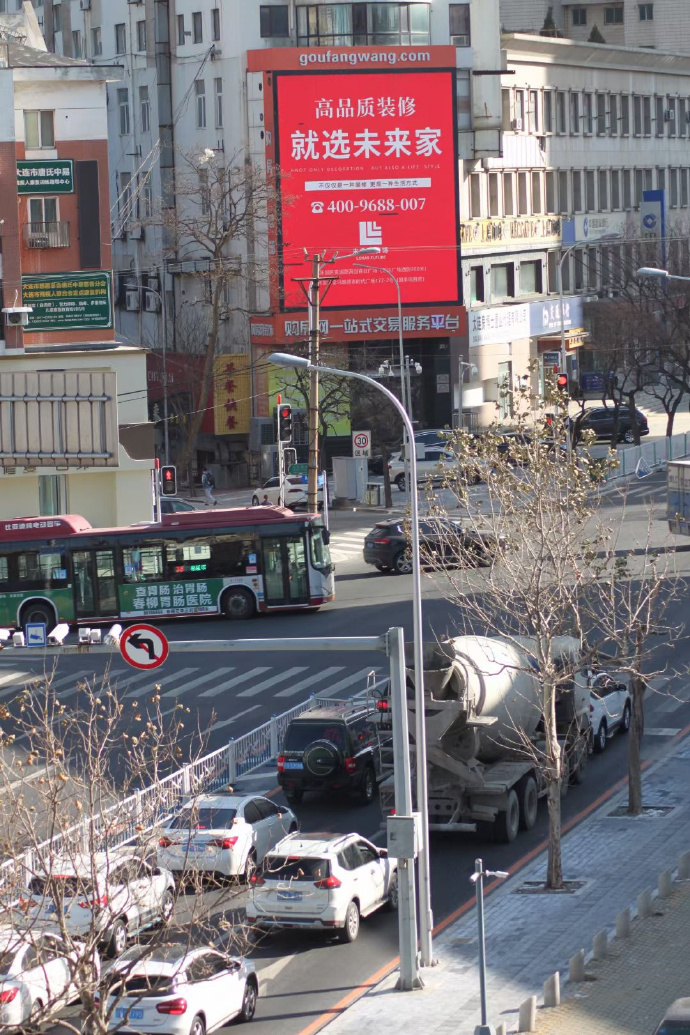 大连市房地产交易大厦位于大连城区中心地段的多岔路口。此块LED大屏设置于市房地产交易大厦的西侧墙面,世界家居广场东,画幅面积近100㎡。该地段离大连市政府直线距离300多米,也是市政府领导上班必经之路,政治曝光俱佳。有6个红绿灯通行路口,是大连市车人流量巨大的路口之一。且该媒体周边无其他媒体干扰,视觉效果好,冲击力强。